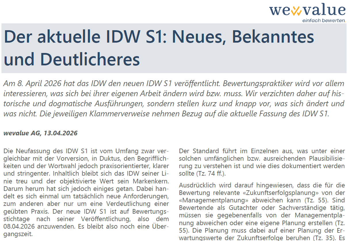 wevalue führt Sie strukturiert durch die Unternehmensbewertung. Von der Erfassung der Vergangenheitsdaten, über die Planung, bis zur Wertermittlung und dem Gutachten: Schritt für Schritt, transparent, effizient und zeitgemäss. Sie konzentrieren sich auf das, was zählt: die erfolgreiche Transaktion. Bewerten Sie Unternehmen im Einklang mit den Fachempfehlungen von EXPERTsuisse.Transparente Modellierung